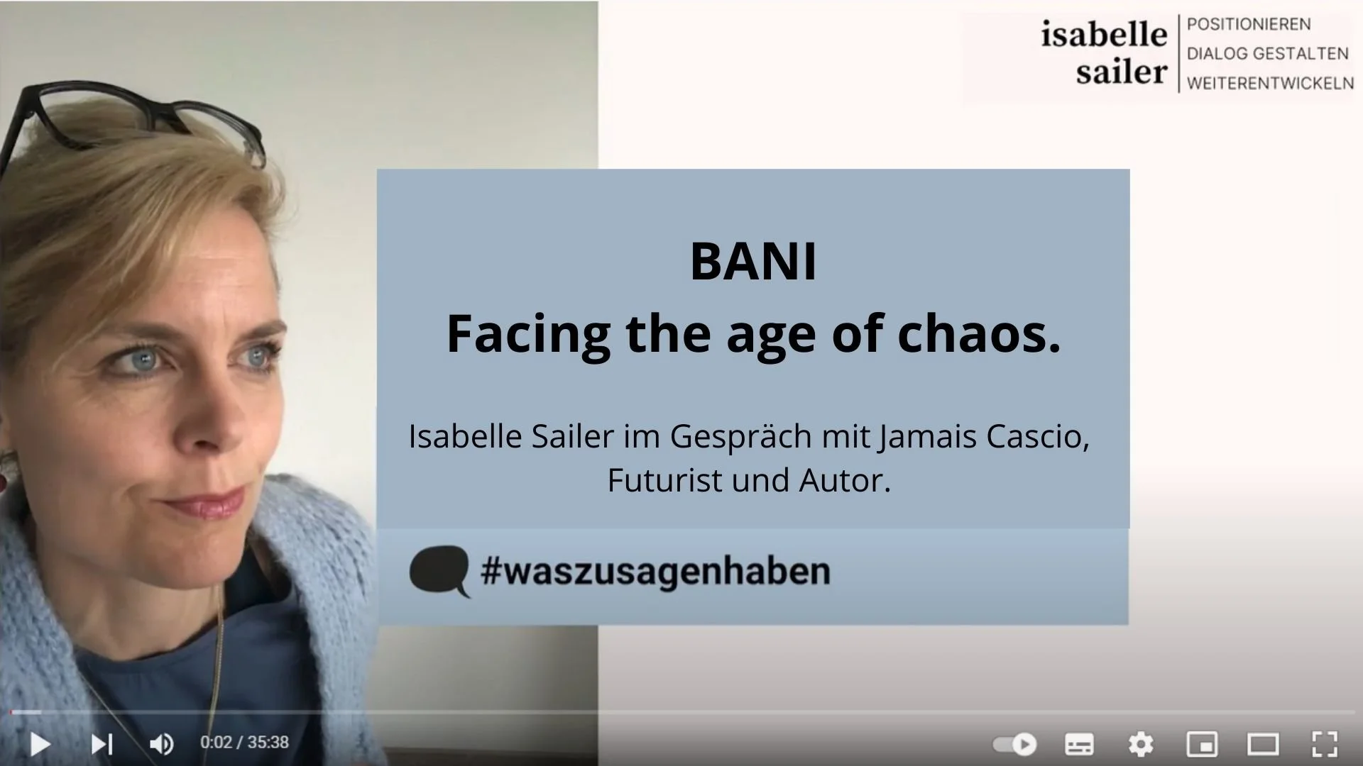 Zusammenschnitt des Gesprächs von Isabelle Sailer mit Jamais Cascio: Erklären, was BANI bedeutet. “Facing the age of chaos”.